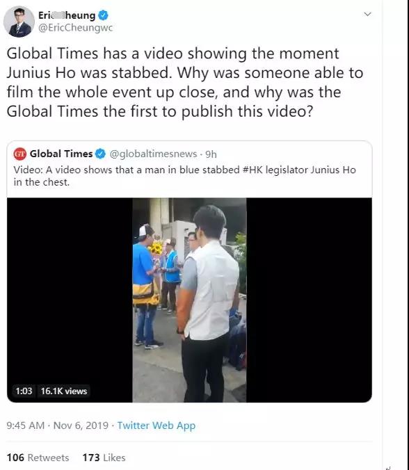 比如,境外社交平台推特上一位认证为香港《南华早报》、英国《卫报》、美国ABC新闻网和CNN等多家媒体供稿的“自由记者”的男子,就在我们《环球时报》发布了何君尧遇刺的视频后,第一时间质问说:“为什么会有人近距离拍到他遇刺的视频?为什么环球时报能第一个发他这个视频”?