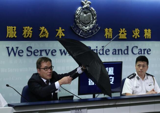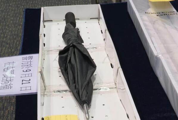 警方在9月的记者会上展示当日搜出被改装成长矛的雨伞。资料图