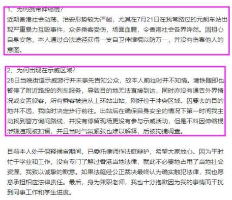 至於16歲香港中學生,則是因為他參與了9月21日屯門非法示威遊行,期間被警方盤查並搜出經改裝長傘(加裝尖鐵棍)、行人杖及鐳射筆……其意圖不言而喻。