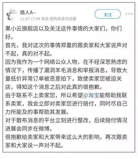 而 “路人A” 也意识到了情况不对,一边劝说羊毛党去退款而不是投诉,并且在广大网友的铁锤下,决定去赔付果小云旗舰店。