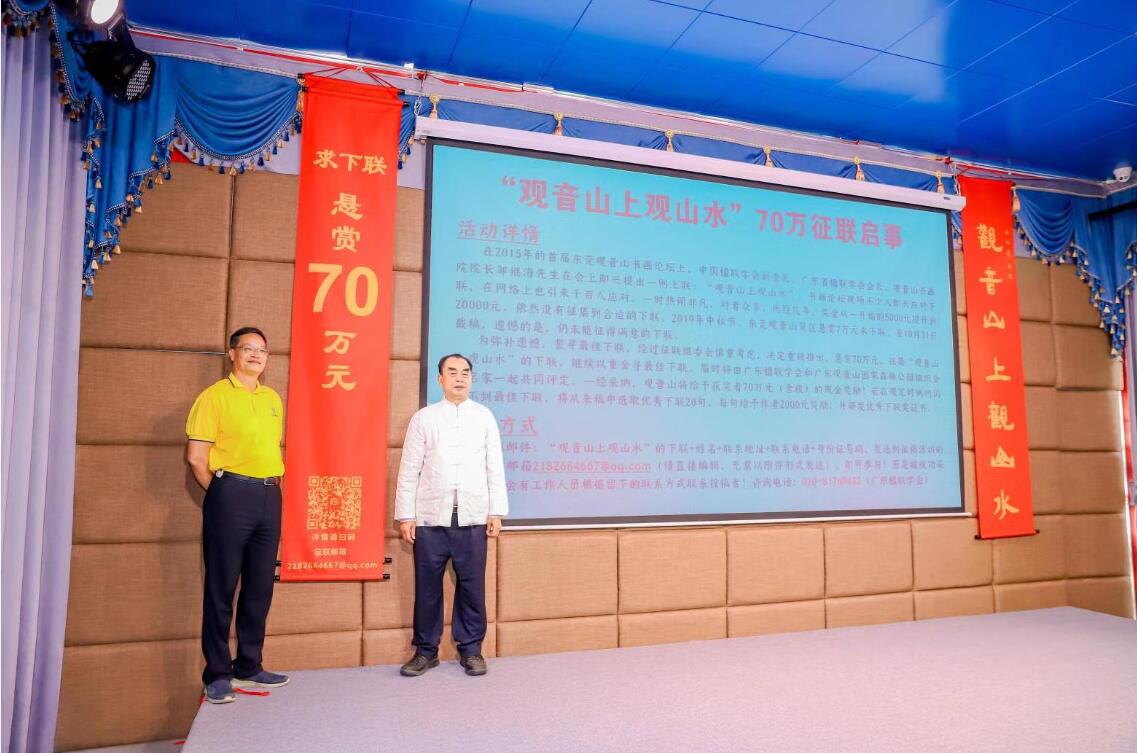 【香港商报网讯】记者程功明报道:7日,“观音山上观山水”妙联品鉴座谈会在素有“文化名山”美誉的东莞樟木头观音山旅游风景区举行,来自北京、天津、安徽、湖北等全国各地的楹联家,雅聚一堂,以联会友,交流互动。座谈会上,观音山景区负责人宣布了一则重磅消息:70万元重金悬赏“观音山上观山水”绝佳下联。1字10万元的征联活动将一直持续到2020年12月31日。消息一经宣布,引爆全场。