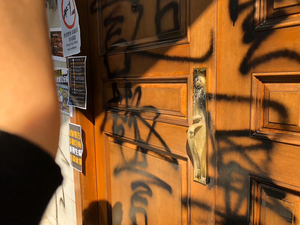 有學生包圍科大校長寓所大量塗鴉,門鎖亦被毀爛。