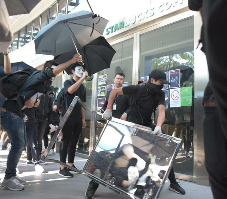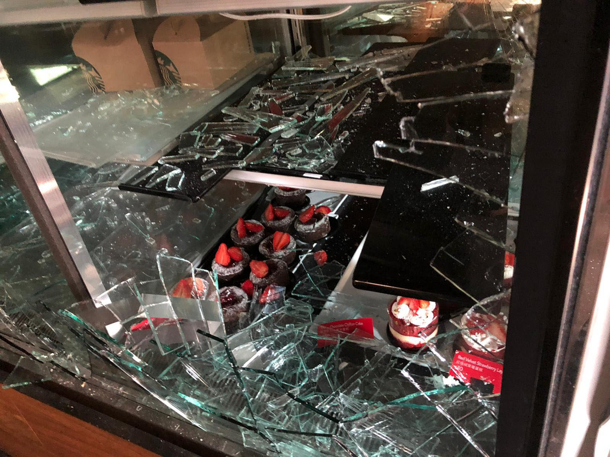 之後黑衣暴徒轉到校內已經關閉的Starbucks,強行闖入之後大肆破壞玻璃食物櫃。他們還推倒收銀機及座位,場面混亂。校內美心旗下餐廳和中銀分行亦遭到破壞。美心旗下飯堂內的餐枱和椅子被人推倒,吧台玻璃被打碎,餐具散落一地,售票機被塗鴉。而中銀分行門外被人噴漆,有暴徒拿着打開的消防水喉往銀行內射水,保安員嘗試阻止不果,現場一片狼藉。