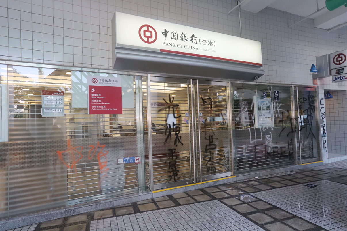 中國銀行玻璃門被噴上字句。記者區天海攝