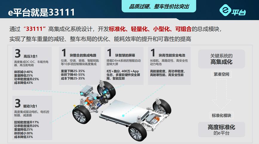 第一個「3」是高集成度的驅動三合一,以e系列車型為例,將幫助車型實現相應的零部件成本降低33%,體積降低30%,重量降低 25%,扭矩密度提升17%,功率密度提升20%,NEDC 效率指標增加1%。
