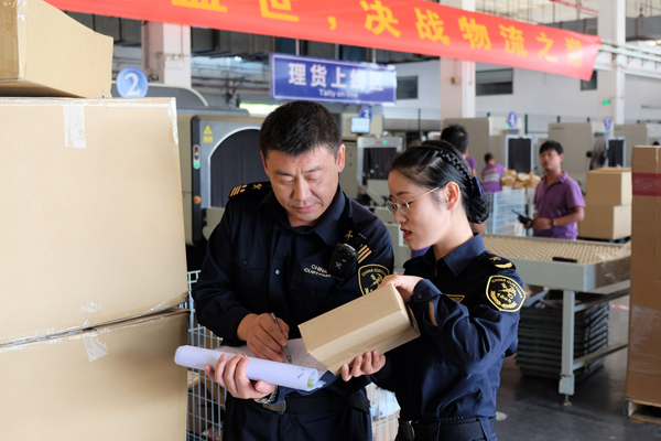 广州海关所属广州白云机场海关关员对跨境电商直购进口货物实施监管。(韩建全摄)
