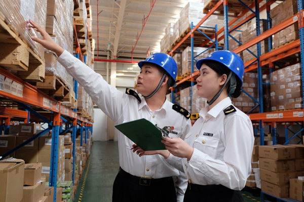 广州海关所属广州白云机场海关现场关员监管跨境电商网购保税进口货物仓储情况。(韩建全摄)