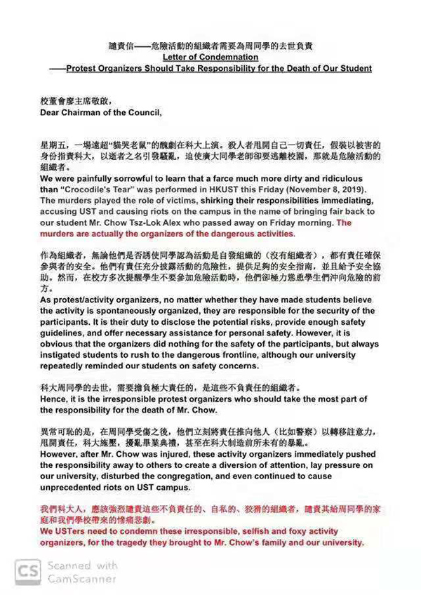 那些狡猾之輩一直在散播恐慌,讓一些同學認為自己如果不繼續搞下去就無路可走。這完全是誤導。如果我們的同學不參加危險活動,沒人會去傷害同學。不要把自己當成極端分子的人肉盾牌。我們的同學都有大好前途,不值得這樣置自己於險地。