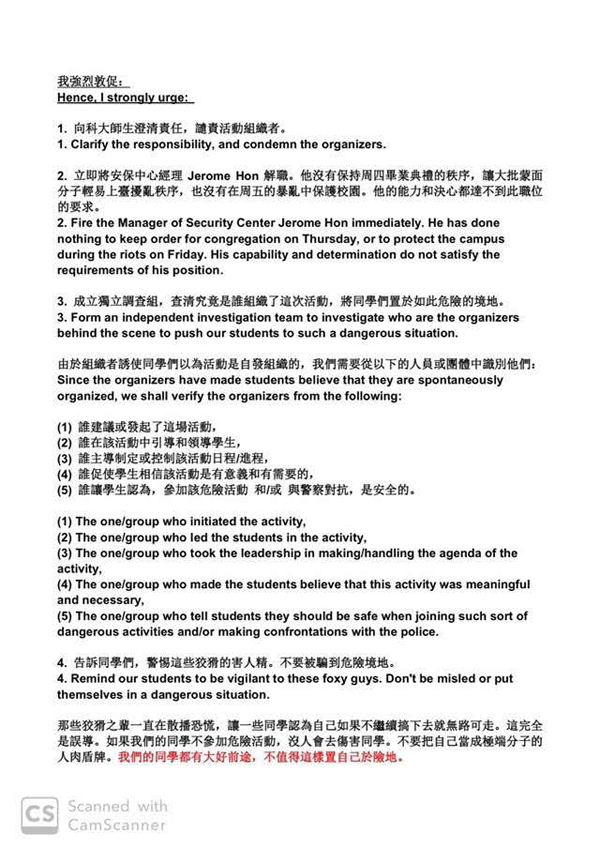 2. 立即將安保中心經理Jerome Hon 解職。他沒有保持周四畢業典禮的秩序,讓大批蒙面分子輕易上台擾亂秩序,也沒有在周五的暴亂中保護校園。他的能力和決心都達不到此職位的要求。