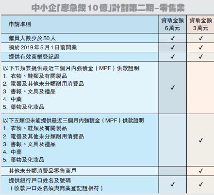 有關中小企須符合一定申請準則,包括僱員人數須少於50人,須於今年5月前開業,並提供有效商業登記證。另外,若有關企業的零售類別在涵蓋範疇內,且能提供強積金供款證明,將可獲每宗6萬元資助;未能提供強積金(MPF)供款證明,或其他未分類消費品零售商戶,每宗則資助3萬元。對於兩者資助金額存在差異,基金會解釋,強積金是企業對社會承擔的指標。