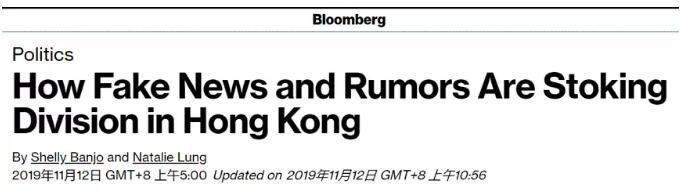 接下来,彭博社又写道,随着香港迈入反政府示威的第23周,这座城市也被大量的网络谣言、假新闻、政治宣传所淹没。但出于“平衡”需要,彭博社又补充说这些谣言、假新闻和政治宣传是来自“双方面”的。