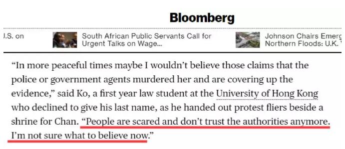但值得注意的是,香港大学一名法律系的学生在接受彭博社采访时却表示,在和平的时期他或许不会相信警方或政府杀害陈并掩盖证据的说法,“但人们现在很害怕,也不相信政府了,所以我也不知道该相信谁”。