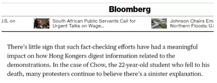 除了其在报道开头提到的周梓乐坠楼死亡案中的谣言,彭博社还提到警方和港府在过去短短24小时之内就不得不连续澄清多条谣言,包括警察被官方允许随意对“示威者”开枪的谣言,银行被官方要求限制现金取款额度的谣言,以及官方将动用紧急权力关闭金融市场和学校的谣言等等。香港特区行政长官林郑月娥不得不呼吁民众要“冷静”和“看清事实”。