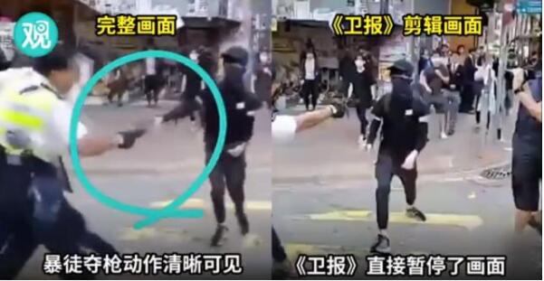 香港11日爆发多起暴力示威事件,西方媒体也纷纷报道,不过其中很多媒体在报道西湾河警察开枪一事时,均选择性忽略了是暴徒抢枪在先。英国《卫报》发布的视频中,画面更是在暴徒伸手抢枪前一秒戛然而止,经过几秒尴尬静止画面后,突兀转至暴徒倒地画面。许多网友都感到不齿,斥责《卫报》故意偏袒暴徒。