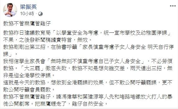 他指,相信學生家長會「無時無刻不慎重考慮自己子女人身安全」,不必勞煩教協。「大三罷」徹底失敗,教協不知是想向誰交差,兩天連出三招,無非是迫全港學校停課。「這就是今天的教協,想做到全港罷課的效果,但不敢公開呼籲罷課,更不敢公開呼籲會員罷教。」