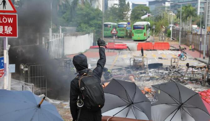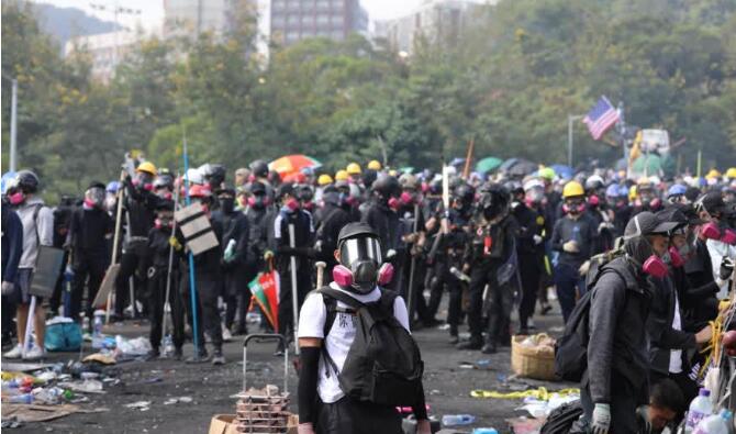 香港中文大學2號橋附近,大批黑衣人以雨傘陣架起防線,還有人在橋頭插上美國國旗。