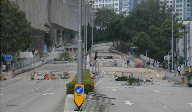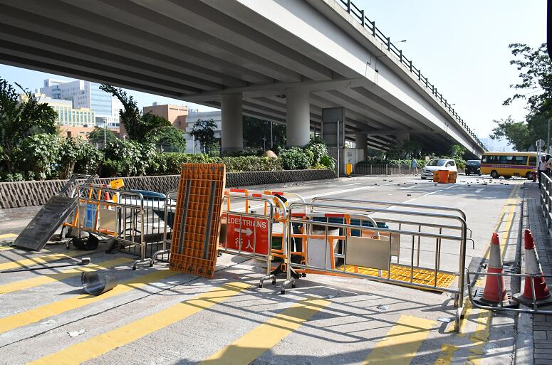 影片可見,數名身穿黑衣的示威者搬垃圾桶出斑馬線,馬路上亦佈滿由示威者放置的磚頭、欄杆等路障,導致巴士無法繼續前行,現場交通受阻。