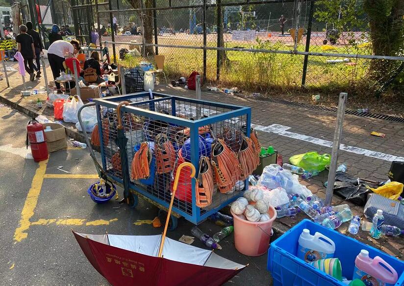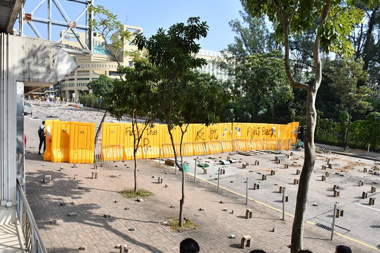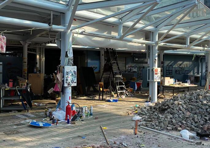 另外,東鐵大學站水管漏水,大量雜物灑落在路軌上,更有塑料支架被綁在高壓電線上。由於昨日遭破壞,中大校內一片狼藉。
