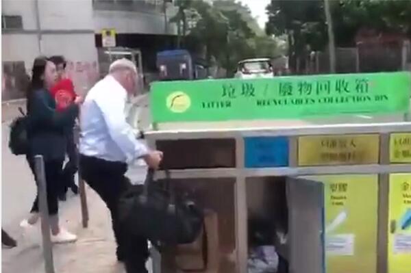 黑衣人阻撓外籍人士搬開垃圾箱。影片截圖