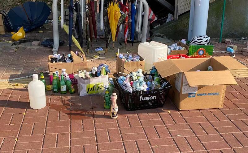 中大地鐵站附近巴士站,暴徒準備了大量汽油彈。