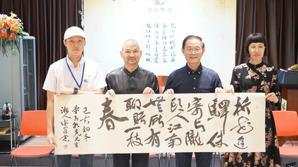 作家們即興揮毫,詩茶相酬。「禪茶一味」「百年陳皮如詩如酒」,衣向東如是寫道。朱秀海則用「一鳴驚人」贈予梁朝晃。「沒有什麼送給你,送你一枝春。」水運憲即興寫下了南北朝詩人陸凱詩:折花逢驛使,寄與隴頭人,江南所有,聊贈一枝春。