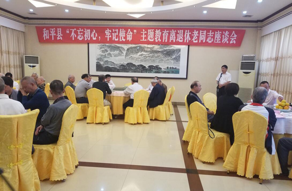 11月1日中午,在“不忘初心、牢記使命”主題教育離退休老同志座談會上,縣委書記陳勁松、縣長黃海生、縣人大常委會主任朱仁恩、縣政協主席吳扶峰等縣領導和離退休老同志們進行了座談。 會上,參會離退休老同志紛紛發言,回憶了入黨的初心,忠誠於黨的決心,暢談了和平近年來經濟社會發展取得的成就,並表示將牢記使命,發揮老同志的正能量作用去支持全縣工作。陳勁松表示,和平能有今天良好的發展局面,離不開曆屆縣委縣政府打下的堅實基礎,離不開老同志的辛勤付出。當前,正在如火如荼開展“不忘初心、牢記使命”主題教育,目的是更好地讓廣大黨員幹部“不忘初心、牢記使命”,記住從哪裏來,到哪裏去,更加勤奮工作,更好地為人民服務。陳勁松強調,近幾年來,和平經濟社會發展取得長足進步,呈現民生有亮點、城市有新貌、鄉村有振興等特點。緊緊圍繞“讀書難、看病難、出行難”等人民群眾關注的焦點,加大投入,積極謀劃,相繼新建改建擴建學校十多所,積極推進“三大交通夢”建設,大力完善縣城基礎設施建設,實現了一年一小變、三年一大變、五年見新城的目標。陳勁松希望,廣大離退休老同志要發揮智囊團和基石的作用,為加快和平各項事業發展建言獻策。