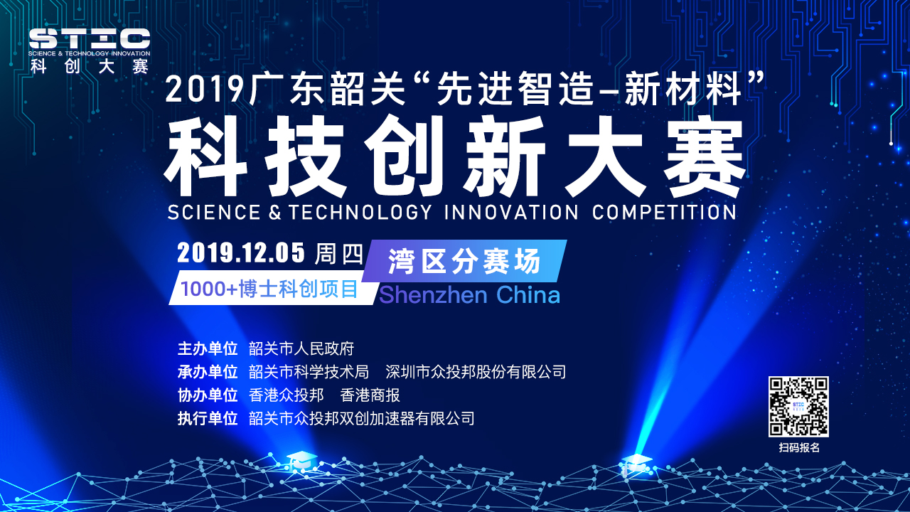 由廣東省韶關市人民政府主辦,韶關市科學技術局、深圳市眾投邦股份有限公司聯合承辦的2019廣東韶關「先進智造-新材料」科技創新大賽以「科技創新 科創上市」為宗旨,輻射全國核心城市科創產業鏈。賽事通過線上海選,線下競選方式選拔。設兩項產業大賽專題(先進制造、新材料)、五大資本城市分賽區:其中有韶關、深圳、廣州、灣區(深圳)、華中(武漢)分賽場。其中,灣區分賽將於2019年12月05日在華潤大廈深圳市眾投邦股份有限公司總部舉行。