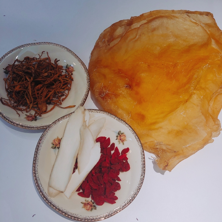 食材(3至4人):花膠筒3隻、蟲草花20克、螺片3片、淮山8片、杞子2湯羹、蜜棗2粒、豬 肉半斤、水2.5升。