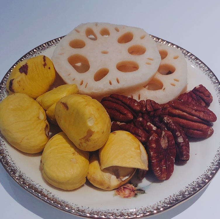 食材(3至4人):紅蘿蔔一條、蓮藕一節、粟米一條、栗子10粒、核桃10粒、圓肉10粒、杞子數粒、蜜棗一粒。