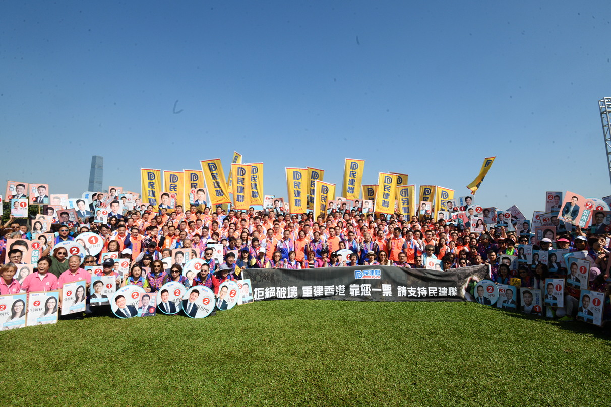 民建聯在添馬公園舉行的區議會選舉誓師大會上,主席李慧琼,副主席陳克勤、張國鈞及元老譚耀宗、葉國謙等均有出席。李慧琼在會上表示,民建聯181位候選人已經準備好星期日打一場硬仗,為守護「一國兩制」、守護法治、守護香港一起拼一場硬仗。她指出,各候選人有共同理念,熱愛祖國,心繫香港,大家共同希望透過參選,實踐大家的抱負,每人都相信憑努力可幫香港、市民,建設香港及社區。