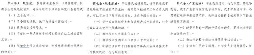 比如,“較重懲戒”對應的是“學生違反校規校紀,情節較重或者經現場教育懲戒拒不改正的”,“嚴重懲戒”對應的是“學生違規違紀、行為失范,屢教不改的,或者嚴重影響教育教學秩序的,或者有欺淩同學、辱罵毆打教師等惡劣情節的”。