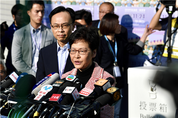 林鄭月娥昨發聲明指,特區政府尊重區議會選舉結果,一定會虛心聆聽意見並認真反思。圖為林鄭前日參加投票後接受媒體訪問。中通社