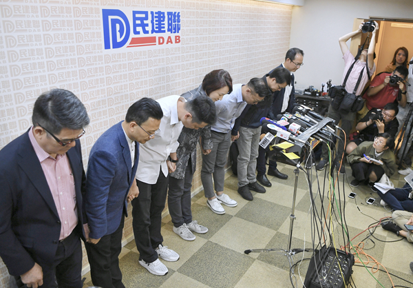 民建聯主席李慧琼與一眾副主席等,昨就區選遭重挫向支持者鞠躬道歉。中通社