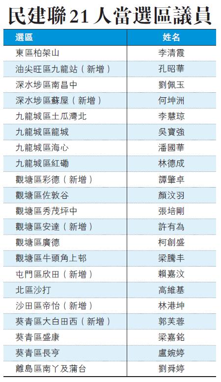 李慧琼昨早聯同副主席陳克勤、陳勇等領導層,在北角民建聯總部會見傳媒,總結今次區議會選舉。在九龍城區土瓜灣北成功連任的李慧琼表示,這次區議會換屆選舉,民建聯派出181人參選,取得21個議席(詳見下表)。她承認民建聯在今次選舉中遭受重大挫折,懇切地向支持他們的市民致歉。她形容過去5個多月,香港形勢急劇惡化,社會動蕩,暴力不止,理解廣大市民對現況感到不滿,對前景感到擔心,並尊重和接受這個選舉結果。