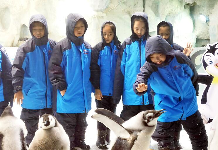 小學生們在企鵝館內與帝企鵝互動