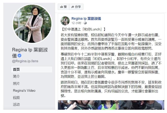 报道称,叶刘淑仪离开后,在脸书个人专页写下被围遭遇,她在文中表示,25日中午12时30分,她到中环看牙医,离开时独自行经毕打街,正好遇上大批人在该区示威,“起初十分和平,有些女士还向我打招呼。后来在现场的记者发现我,便走上来围着我采访,过了不久更惹来一群为数上百、且非常粗暴的示威者。他们不断向我指骂,言语十分不堪,还有搞事者向我泼水。”