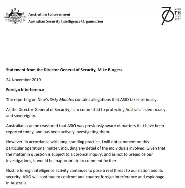 ASIO昨天深夜罕见地发表声明,表示一直在积极调查此事。