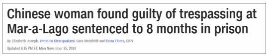 9月,陪审团裁定张玉静因闯入特朗普私人庄园并提供虚假证词,被控两项罪名成立。