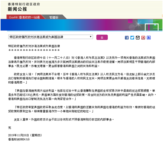 香港特别行政区政府今日(十一月二十八日)对《香港人权与民主法案》以及另外一项有关香港的法案成为美国法律表示强烈反对,并对美方无视港方多次就两项法案提出的切实关注表示极度遗憾。两项法案明显干预香港的内部事务,既无必要,亦毫无理据,更会损害香港和美国之间的关系和利益。