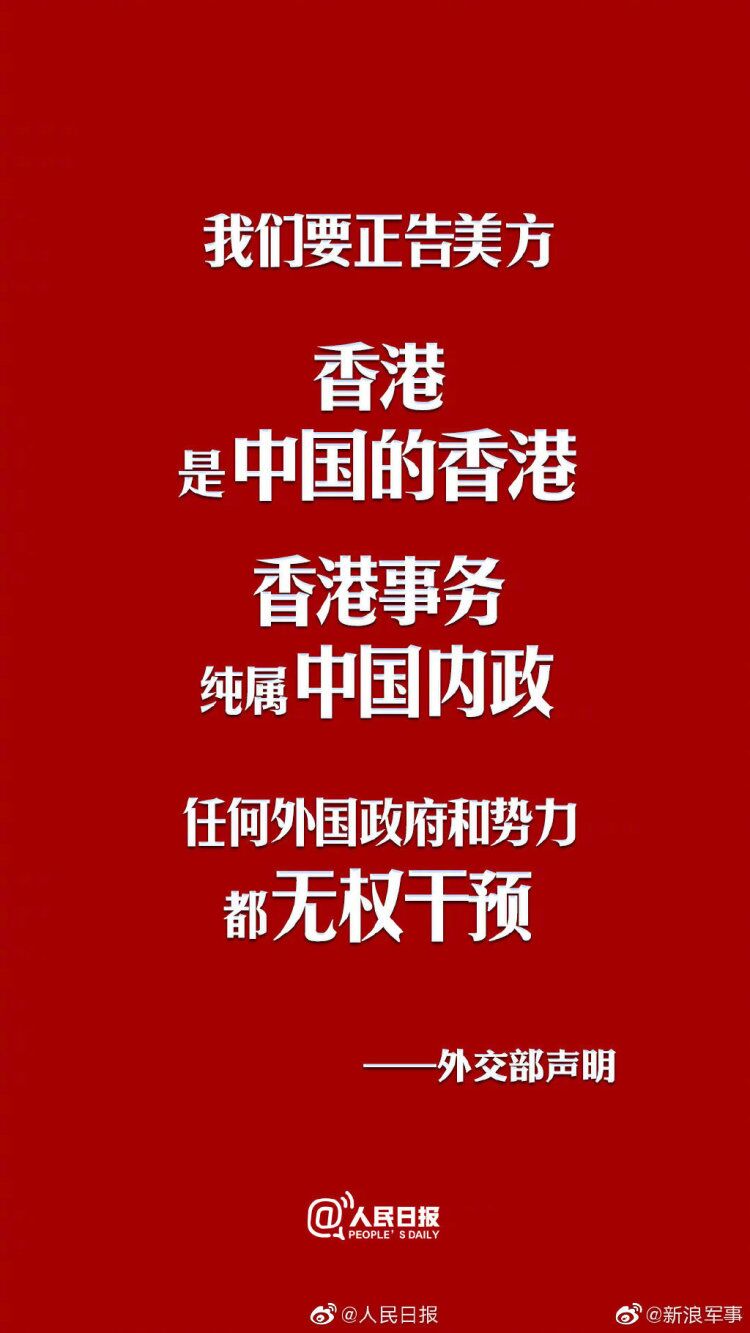 外交部声明:美方将所谓“香港人权与民主法案”签署成法,此举严重干预香港事务,严重干涉中国内政,严重违反国际法和国际关系基本准则,是赤裸裸的霸权行径,中国政府和人民坚决反对。
