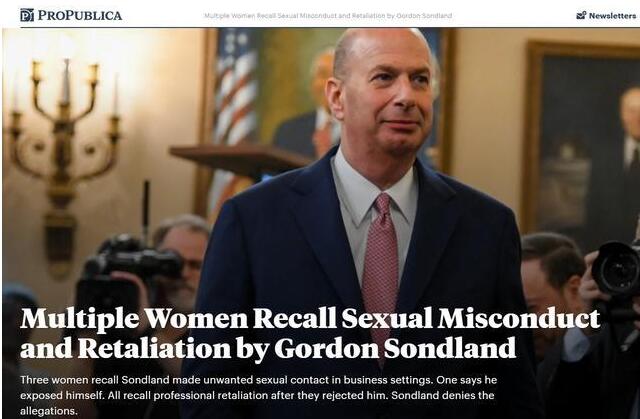 美国总统特朗普的弹劾调查即将进入关键阶段,调查的核心证人、美国驻欧盟大使桑德兰突然被曝性骚扰丑闻。