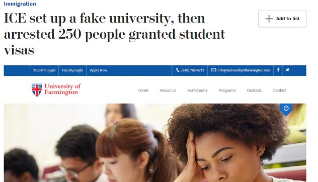 10个月前,美国联邦法院文件显示,美国移民局官员2015年创建了一所假大学,交由美国国土安全部运营,以吸引那些持学生签证并试图留在美国的外国学生。