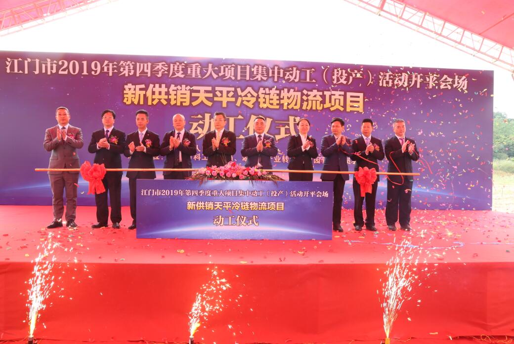 在當天活動主會場--翠山湖產業科技園新供銷天平冷鏈物流項目動工現場,江門市副市長蔡德威,江門有關部門領導,開平市領導鄺積康、何武健、何光駿、范拓源,企業代表及相關單位人員齊聚,共同見證“招商引資突破年”項目建設成果。
