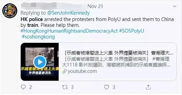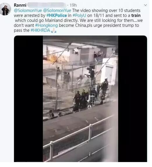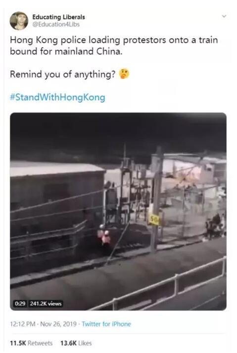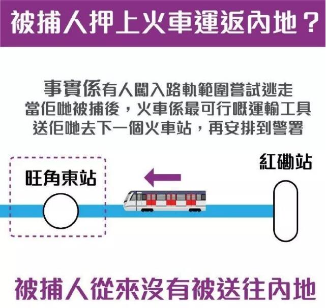 早些时候,在推特等境外社交媒体上,有人上传视频片段,臆造香港警方将大批被逮捕的示威者押上火车,疑似运往内地。更有夸张者造谣这些被捕者是香港大学的学生,他们手脚被反绑,将被押送到内地进行“审讯”,人群中不乏未成年人。