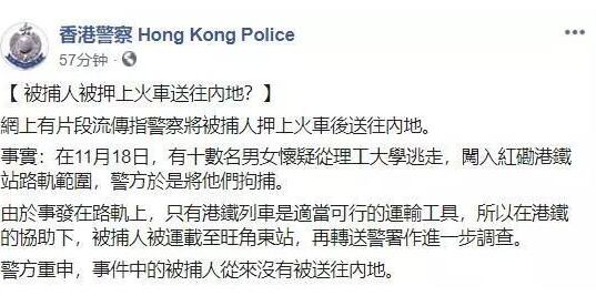 近日在境外社交媒体平台上,有传言称香港警察疑似将被捕示威者押上火车后送往内地。香港警方发文驳斥了这一谣言。