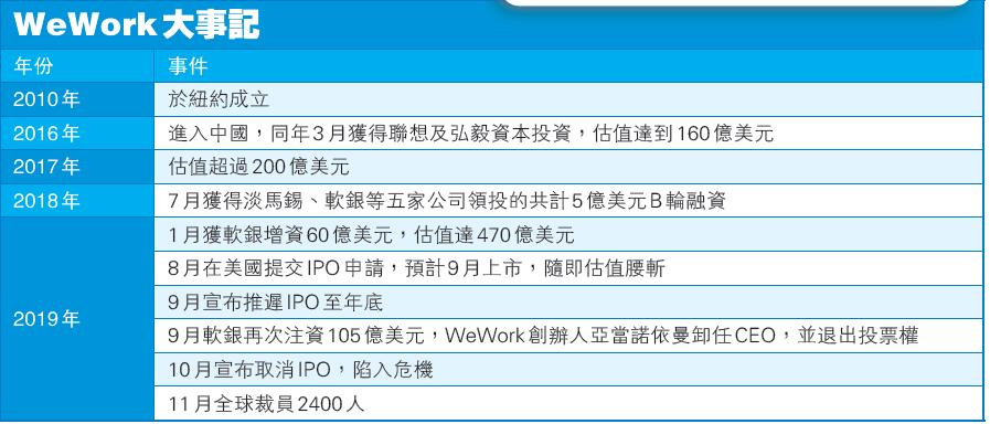 WeWork原本形勢大好,有可能是今年美股第二大IPO、繼Uber之後最受關注的科技獨角獸。但卻遭遇滑鐵盧,WeWork特點不明確的商業模式、混亂的家族式管理、不見好轉的財務狀況以及其創始人亞當?諾伊曼在飛機上吸食大麻被曝光等多個撲面而來的負面消息,令投資者對其前景大為質疑,導致其估值在準備上市的過程中由470億美元下降到231億美元,幾近腰斬。
