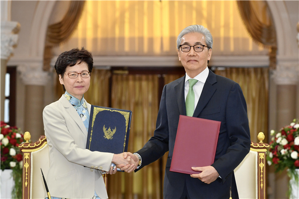 林鄭月娥(左)與泰國副總理頌吉簽署加強兩地經濟關係的備忘錄。