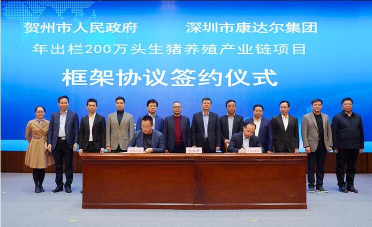 【香港商報訊】記者易小婧報道:繼11月18日在海南文昌拿下30萬頭生豬產業鏈項目後,2019年11月30日,深圳市康達爾(集團)股份有限公司(以下簡稱「康達爾」)與廣西壯族自治區賀州市人民政府簽訂了《康達爾賀州市年出欄200萬頭生豬養殖產業鏈項目投資框架協議》,在生豬養殖領域跑出了「加速度」,為公司加速布局粵港澳大灣區、實施其「深化農業主業發展」戰略規劃再注入一劑「強心針」。