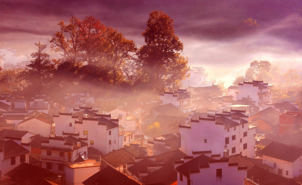 江西省婺源拍摄的烟雾弥漫的石城景色。