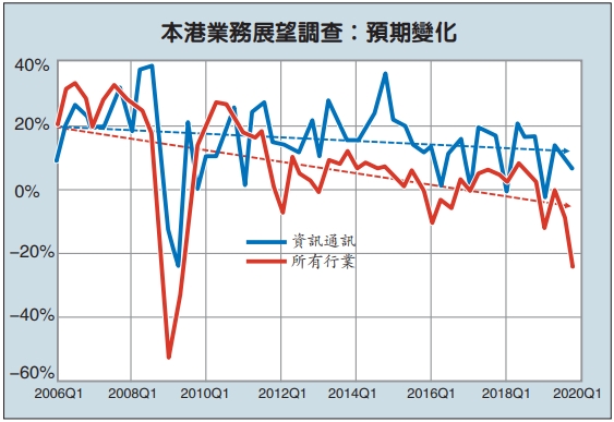 然而,真正從事科技行業者,對前景看法倒不淡。按政府對本港業務調查所見,最接近科技界的資訊通訊行業與所有行業對前景變化的預期中,前者穩定,後者趨跌。留意這個現象難於三幾季內短期見到,但相隔十年過外則高下立見。這是偶然現象?